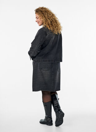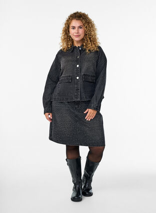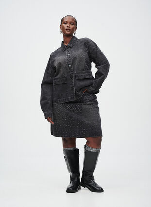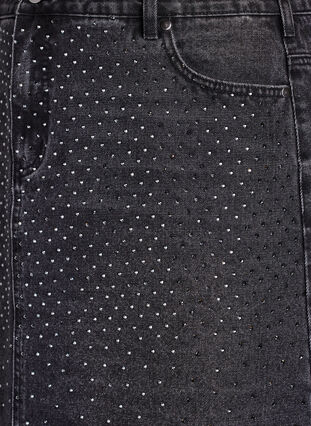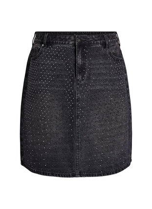 Kort jeanskjol med glittriga strass framtill som ger en skimrande, iögonfallande look. Den har klassisk 5-ficksdesign med bälteshällor och knäppning med dragkedja och knapp. Den lätt a-linjeformade silhuetten ger en bekväm passform och gör kjolen enkel att styla både till vardags och fest.