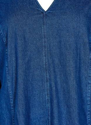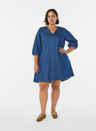 Kort jeansklänning i 100% bomull med normal passform och dekorativa sömmar fram och bak, vilket ger den en enkel och snygg look. Klänningen har v-ringning, sidofickor och 3/4-långa puffärmar med elastiska ärmslut.