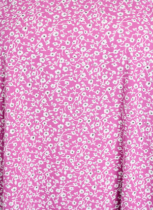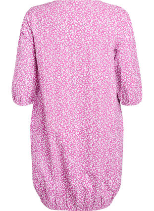 Bekväm klänning i 100% bomull med ett vackert tryck och lös passform. Klänningen har rund halsringning, trekvartsärmar med elastiska ärmslut, praktiska sidofickor och en elastisk fåll längst ner som skapar en snygg ballongsiluett.