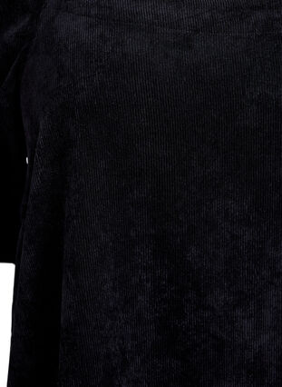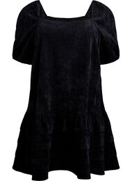 Kort klänning i mjuk och skön manchester med ärmar till armbågen och elastiska ärmslut som skapar en lätt puffeffekt. Klänningen har en fyrkantig halsringning med elastisk kant och en lös, a-linjeformad silhuett som ger ett feminint och mjukt fall. Dekorativa volanger ger extra rörelse till klänningen.