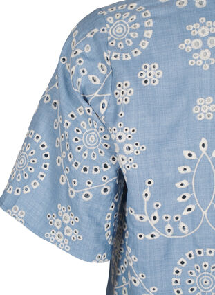 Kort klänning med ett feminint broderat blommönster och en v-ringning. Klänningen har normal passform, korta, lösa ärmar och är tillverkad i ett lätt och luftigt material.