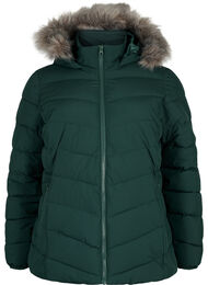 Kort och praktisk vinterjacka med dekorativa diagonala sömmar och varm Sorona®-vaddering som ger samma värme som dun - men i en lättare version. Modellen har hög krage och huva med avtagbar fuskpäls som ger extra skydd kalla dagar. Ytan är vattenavvisande och håller dig torr vid lätt regn.