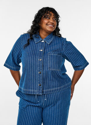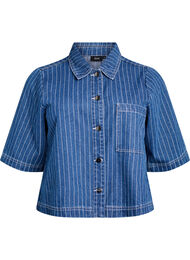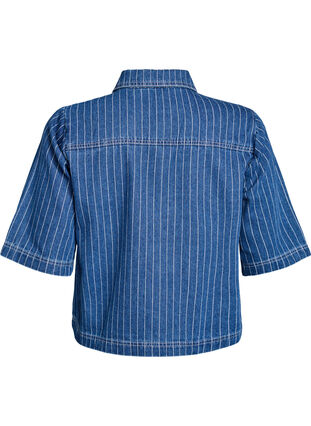 Kort jeanskjorta med smala ränder i mjuk och skön denimkvalitet med lätt stretch. Skjortan har ärmar till armbågen, krage, bröstficka och en avslappnad passform med knäppning framtill.