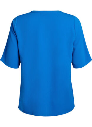Enfärgad blus med V-ringning och korta ärmar. Blusen har en lös passform och är tillverkad i lättviktskvalitet med 55 % återvunnen polyester.