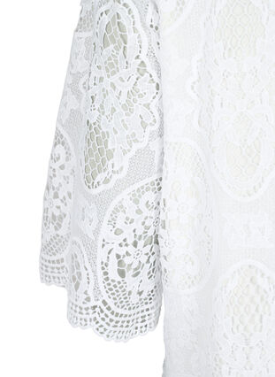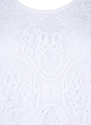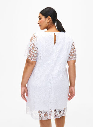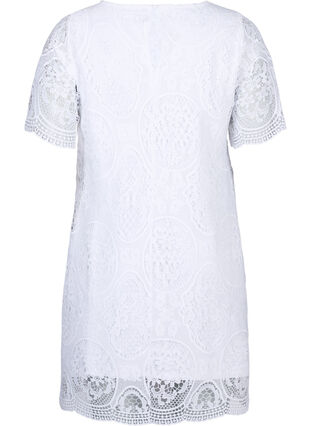 Kort festklänning i vackert spetstyg med mjukt viskosfoder. Klänningen har transparenta ärmar med armbågslängd, rund halsringning med nyckelhålsöppning bak i nacken och normal passform.