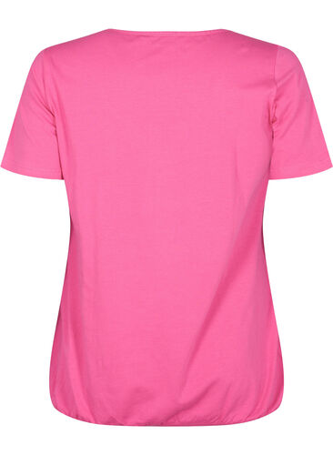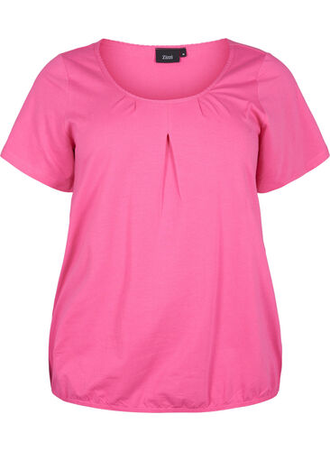 Lång och bekväm t-shirt med korta ärmar som är tillverkad i mjuk bomullskvalitet. T-shirten har en rund halsringning med spetskant, små draperingar och fåll med resårkant.