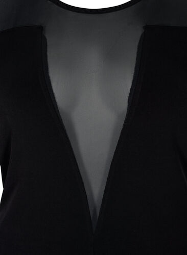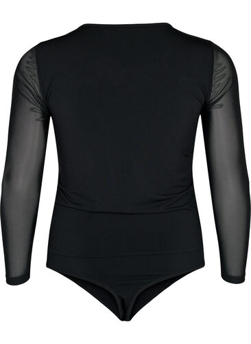 Kroppsnära body med rund hals med djup v-ringning i mesh, långa meshärmar och stängs nedtill med tryckknappar. Den är tillverkad i en bekväm och stretchbar kvalitet.