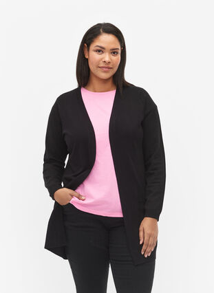 Lång stickad kofta i en mjuk viskosblandning i en bekväm och löst sittande design. Koftan har fickor på framsidan och ribbstickade kanter.