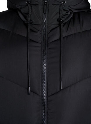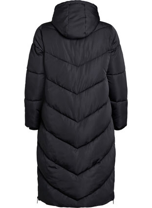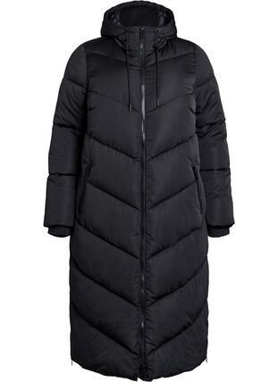 Lång pufferkappa med dekorativa sömmar, en vattenavvisande yta och varm vaddering. Kappan stängs med en tvåvägsdragkedja och har praktiska dragkedjor i sidorna som kan öppnas för extra rörelsefrihet och ventilation. Dessutom har den en huva med justerbara dragskor, sidofickor med dragkedja och ribbade muddar vid ärmsluten för att hålla vinden ute.