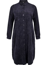 Lång skjortklänning i manchester med knäppning hela vägen fram, krage, bröstfickor, slitsar i sidorna och långa ärmar med manschetter och knapp. Klänningen har en normal passform och är tillverkad i ett lätt material som innehåller 51% återvunnen polyester.