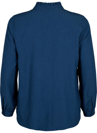 Blus med ett vackert strukturmönster i tyget och en normal passform med slitsar i sidorna. Blusen har en dekorativ detalj med rynkade veck framtill med knappar, en volangkrage och långa ärmar med manschetter.