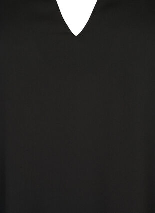 V-ringad blus med långa ärmar, mudd och knapp. Baksidan av blusen har små rynkor för en fin drapering.