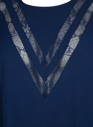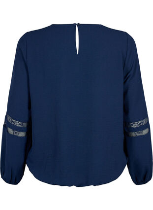 Blus med dekorativa spetsband och elastisk kant på ärmar och fåll, som skapar en fin ballongeffekt. Blusen är tillverkad av 51 % återvunnen polyester och har nyckelhålsstängning i halsen.