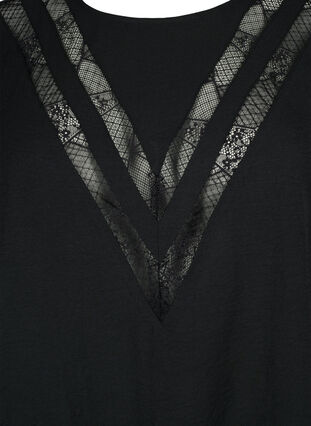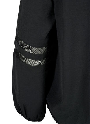Blus med dekorativa spetsband och elastisk kant på ärmar och fåll, som skapar en fin ballongeffekt. Blusen är tillverkad av 51 % återvunnen polyester och har nyckelhålsstängning i halsen.