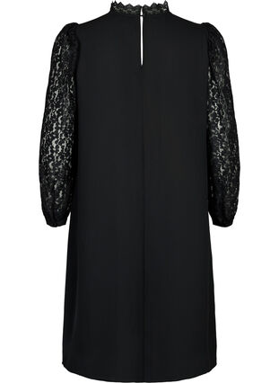 Feminin klänning med vacker spets över bröstet och på ärmarna, och knäpps med en knapp bak i nacken. Klänningen är tillverkad i en lättviktskvalitet utan foder och har en löst sittande A-linjeformad silhuett med en slits i sidan.