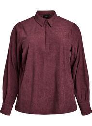 Blus i mjuk manchester med en lös och bekväm passform. Stilen har en klassisk krage, dold knäppning med en synlig knapp upptill och långa ärmar med manschetter och knappstängning.