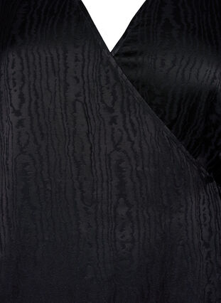 Midiklänning i 100 % viskos med vackert mönster ton-i-ton. Klänningen har långa ärmar med vida muddar och V-ringning omlott samt knytband i sidan.