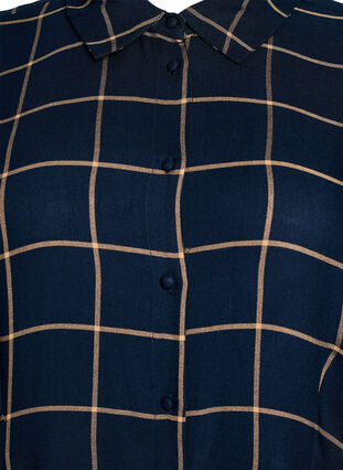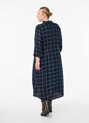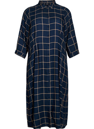 Lång skjortklänning i 100% viskos med klassiskt rutmönster. Klänningen har en lös och avslappnad passform med rakt snitt som ger ett bekvämt fall. Stilen har knäppning hela vägen framtill, klassisk skjortkrage och 3/4-ärmar med manschetter.