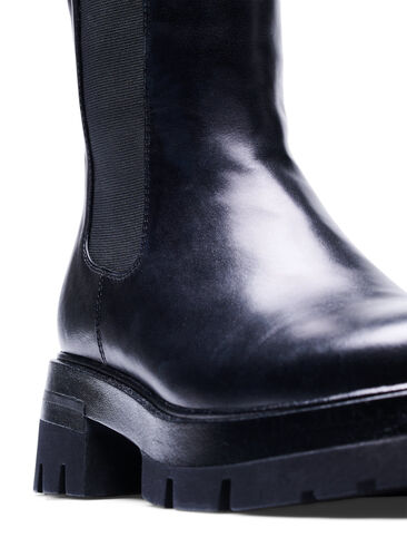 Läderstövel med grov sula, som är utformad med bred passform. Stöveln har resår på båda sidor av skaftet och extra bredd vid vaden för att säkerställa bästa möjliga passform.