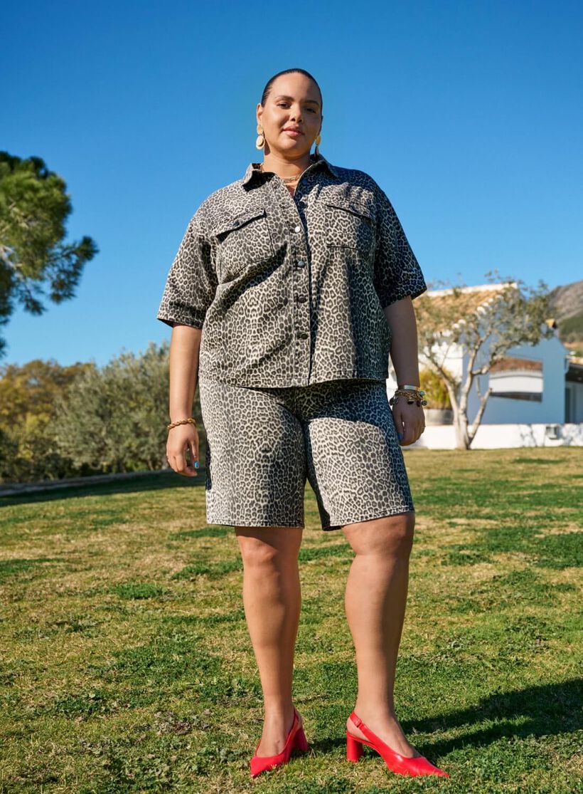 Trendiga Bermudashorts i ett leopardmönstrat denimtyg, tillverkade av 100% bomull. Shortsen har hög midja och vida ben. Modellen har klassiska jeansdetaljer som fickor fram och bak, samt gylf med dragkedja.