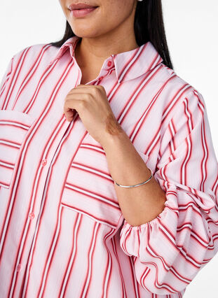 Lös skjorta med ett vackert randigt mönster i ett lätt och smidigt tyg som känns skönt mot huden. Skjortan har en klassisk krage, helknappstängning, bröstfickor och långa ärmar med elastiska muddar.