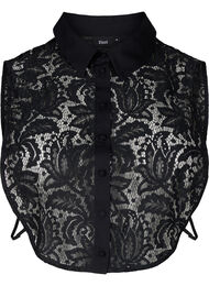 Lös skjortkrage i feminint spetstyg med matchande tygknappar. Kragen har elastiska sidor som gör att den sitter tätt och är bekväm och enkel att bära under tröjor eller klänningar.