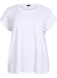 T-shirt med rund halsringning och korta uppvikta ärmar. T-shirten har en lös och avslappnad passform med ett mjukt fall och är tillverkad i ett mjukt och stretchigt material med viskos.