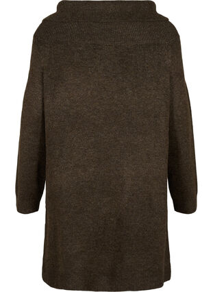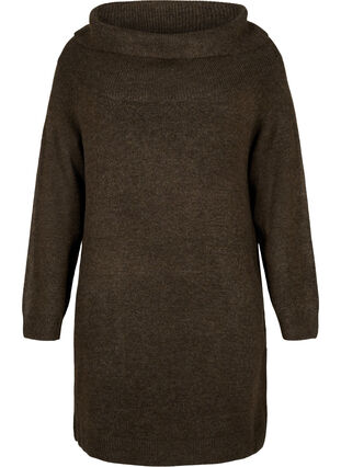 Melerad stickad klänning med långa ärmar, ribbade muddar och en bred krage som även kan bäras off-shoulder.
