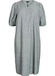 Midiklänning med armbågslånga ärmar med elastiska muddar och rynkad effekt vid axlarna, en V-formad halsringning med bred kant och bekväm passform. Klänningen är tillverkad i en mjuk linne- och viskosblandning som andas och har en lätt textur, vilket gör den bekväm och perfekt för varmare dagar.