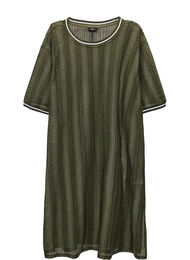 Lös klänning i en lätt och skir jerseykvalitet med dekorativt hålmönster och vertikal struktur. Stilen har rund halsringning, korta ärmar och ribbade kanter med kontrastfärgade ränder, vilket ger en sportig look. Passformen är avslappnad och klänningen har slitsar i sidorna och inget foder, vilket gör den perfekt för lager-på-lager.