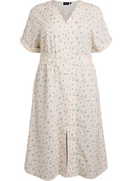Midiklänning med slits fram, v-ringning, korta upprullade ärmar och ett brett elastiskt midjeband som skapar en feminin siluett. Klänningen har en dekorativ knappdetalj framtill och är tillverkad av 100% bomull med ett sött litet blommigt tryck och diskreta vertikala ränder.