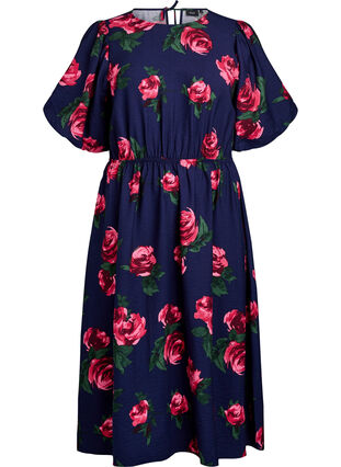 Feminin midiklänning med ett vackert rosmönster, rund halsringning med öppning och knytning i nacken, och korta ballongärmar med innerfoder som ger volym. Klänningen har en elastisk midja vilket skapar en feminin siluett och låter den rynkade kjolen falla vackert runt kroppen. Denna klänning innehåller 92% LENZING™ ECOVERO™ viskosfibrer, vilket ger naturlig mjukhet och fall.