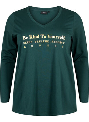 Långärmad pyjamasblus i 100 % bomull med V-ringning och text tryckt på bröstet.