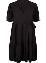 Kort klänning i feminin a-linjeformad modell med paneler och veck som skapar ett fint, löst fall. Klänningen har omlott-effekt upptill, knytband i sidan och korta ärmar med elastiska muddar som ger en fin, puffig effekt. Tillverkad i ett mjukt material med 55% återvunnen polyester.