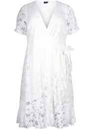 Feminin omlottklänning i vackert spetstyg med mjukt viskosfoder. Klänningen har korta ärmar med volangdekor, V-ringning och ett fast knytband i midjan för en feminin silhuett.