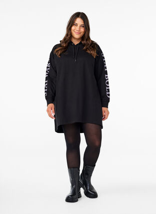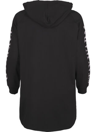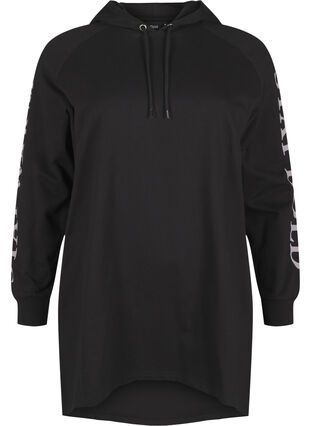 Långärmad oversize sweatshirt i 100 % ekologisk bomull med dragsko i huvan och tryckdetaljer på ärmarna. Sweatshirten är längre baktill för en modern look.
