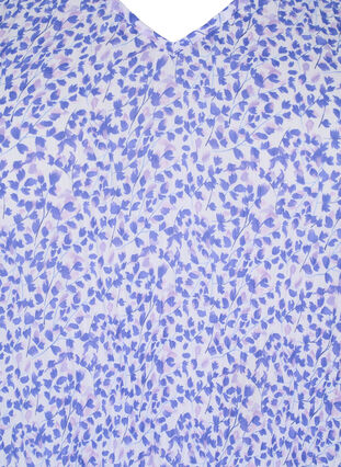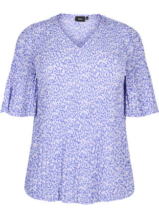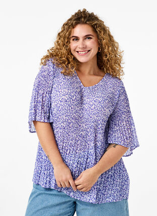 Feminin blommig blus i en fin plisserad kvalitet, som faller lätt. Blusen har en lös passform med v-ringning och 2/4-ärmar.