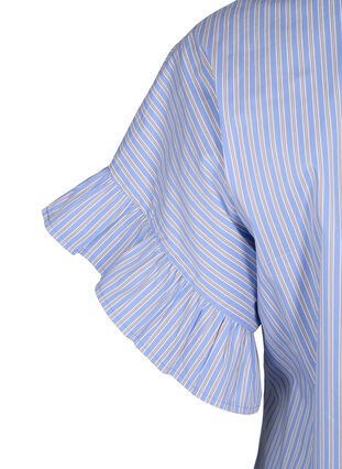 Blus i stretchig bomull med klassiskt randigt mönster. Blusen har korta ärmar med utsvängda och volangförsedda kanter, v-ringning med volangförsedd krage och en lös passform med peplum, vilket skapar en feminin silhuett.
