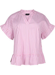 Blus i stretchig bomull med klassiskt randigt mönster. Blusen har korta ärmar med utsvängda och volangförsedda kanter, v-ringning med volangförsedd krage och en lös passform med peplum, vilket skapar en feminin silhuett.