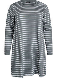 Bekvämt nattlinne i mjuk, andningsbar jersey i 100% ekologisk bomull med fina, vågräta ränder. Den har rund halsringning, långa ärmar och en liten bröstficka som ger en avslappnad pyjamaslook. Passformen är lös med slitsar i sidorna och a-linjeformad.