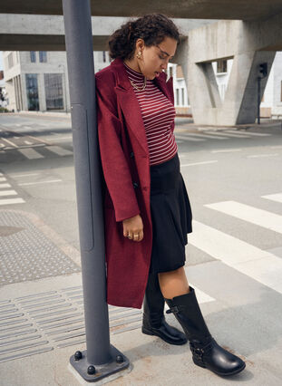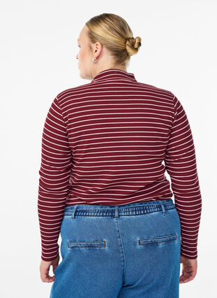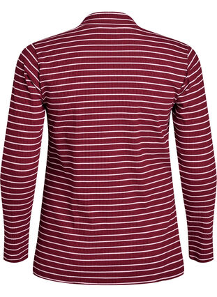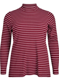 Tidlös basblus i mjuk och stretchig bomullsjerseykvalitet med ribbstickad textur och randigt mönster. Stilen har hög hals, långa ärmar och en bekväm passform med lätt a-linjeformad silhuett. Ett mångsidigt plagg som funkar perfekt ensam eller lager-på-lager under en stickad tröja eller väst.