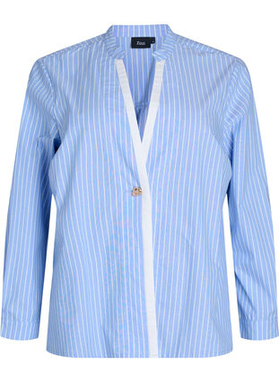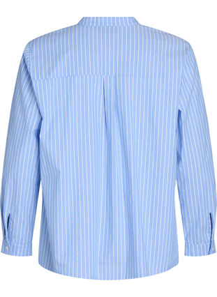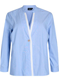 Randig skjorta i 100% bomull med liten ståkrage, djup v-ringning med kontrastkant och dekorativ guldfärgad knäppning framtill. De långa ärmarna avslutas med manschetter och knappar, medan en bred veck i ryggen ger extra vidd, ett vackert fall och en lös, bekväm passform.