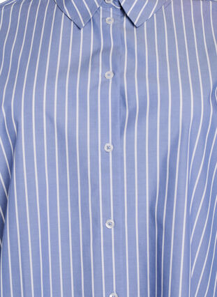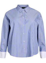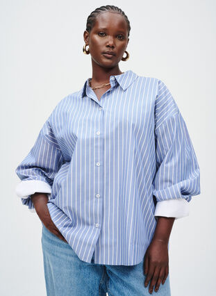 Snygg skjorta i en slät, vävd bomullsblandning med smala, vertikala ränder. Skjortan har en lös, boxig passform och klassisk krage med knäppning framtill. De långa ärmarna avslutas med breda manschetter i en kontrasterande vit färg, vilket ger en modern twist till den annars klassiska designen. Skjortan har ok med horisontella ränder och en veck i ryggen, vilket ger extra utrymme. Bär den med jeans, kostymbyxor och kjolar för en elegant, avslappnad look.