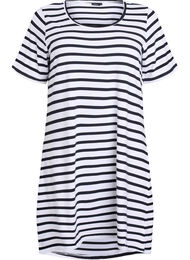 Bekväm trikåklänning med klassisk randig design och lös passform med a-linjeform. Klänningen är tillverkad i en mjuk bomullskvalitet och har korta ärmar och rund hals.
