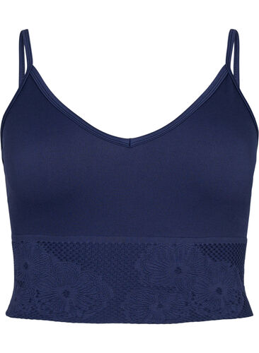 Sömlös bh-topp utan bygel och med mjuka uttagbara inlägg. BH:n har smala justerbara axelband, är v-ringad och har en fin struktur i tyget.