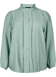 Skjortblus i härligt viskostyg med dekorativa detaljer framtill. Skjortblusen är designad med en volangkrage och långa ärmar med elastiska manschetter och små veck på axlarna som skapar en lätt puffärm.