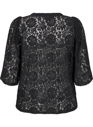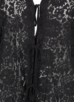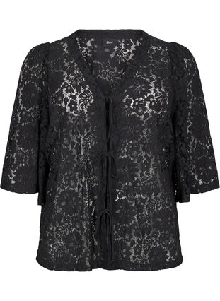 Feminin spetsblus med vackra blomdetaljer i en lätt och elegant design utan foder. Blusen har normal passform, lösa trekvartsärmar och öppen front med tre fina rosetter som dekorativa knäppningar.