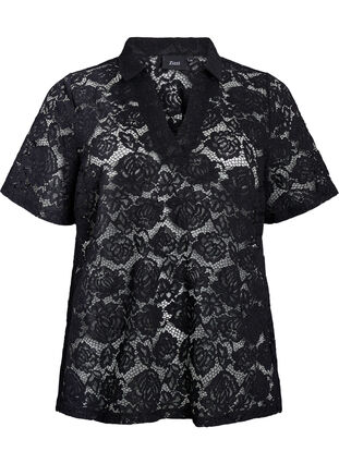 Feminin spetsblus i ett mjukt och lätt material med blommig struktur och normal passform. Blusen har korta ärmar, krage och V-ringning, och är tillverkad av skirt spetsmaterial utan foder.