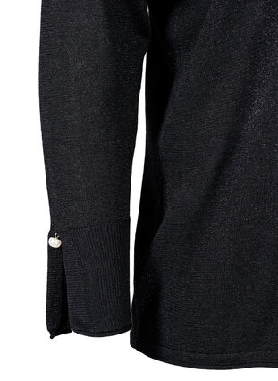Feminin stickad blus med glitter, gjord i en mjuk viskosblandning. Blusen har V-ringning, långa ärmar, slits och pärlor.