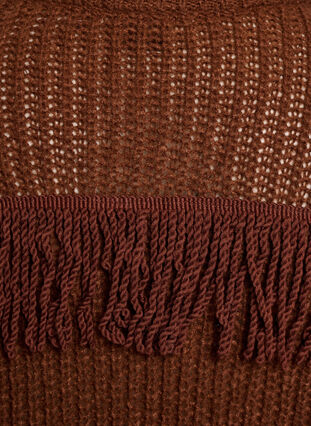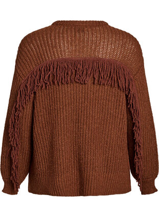 Stickad blus i grovstickad kvalitet med rund halsringning, långa ärmar och en lös, bekväm passform. Blusen är designad med en dekorativ fransdetalj över ryggen som fortsätter ner längs ärmarna, samt en luftig textur.